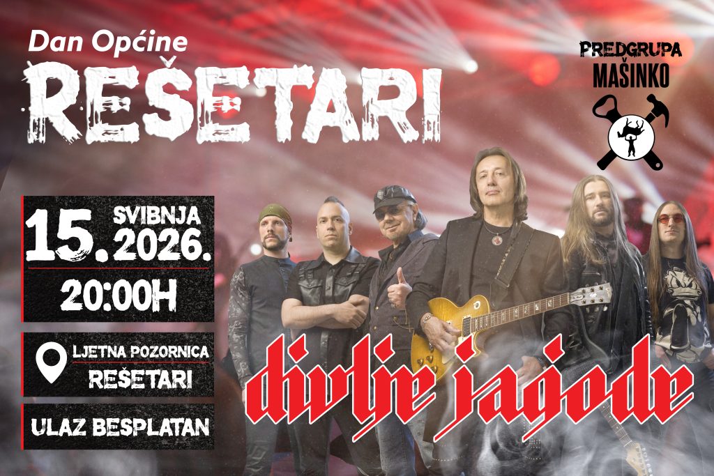 U sklopu obilježavanja Dana Općine Rešetari, sve mještane i posjetitelje očekuje vrhunski glazbeni događaj na otvorenom! U petak, 15. svibnja 2026. godine s početkom u 20:00 sati, na ljetnoj pozornici u Rešetarima nastupit će legendarni rock sastav Divlje jagode, jedan od najpoznatijih bendova regionalne glazbene scene. Kao predgrupa publiku će zagrijati energični sastav Mašinko, koji […]