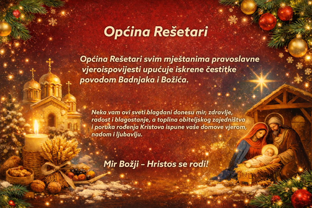 Općina Rešetari svim mještanima pravoslavne vjeroispovijesti upućuje iskrene čestitke povodom Badnjaka i Božića. Neka vam ovi sveti blagdani donesu mir, zdravlje, radost i blagostanje, a toplina obiteljskog zajedništva i poruka rođenja Kristova ispune vaše domove vjerom, nadom i ljubavlju. Mir Božji – Hristos se rodi!